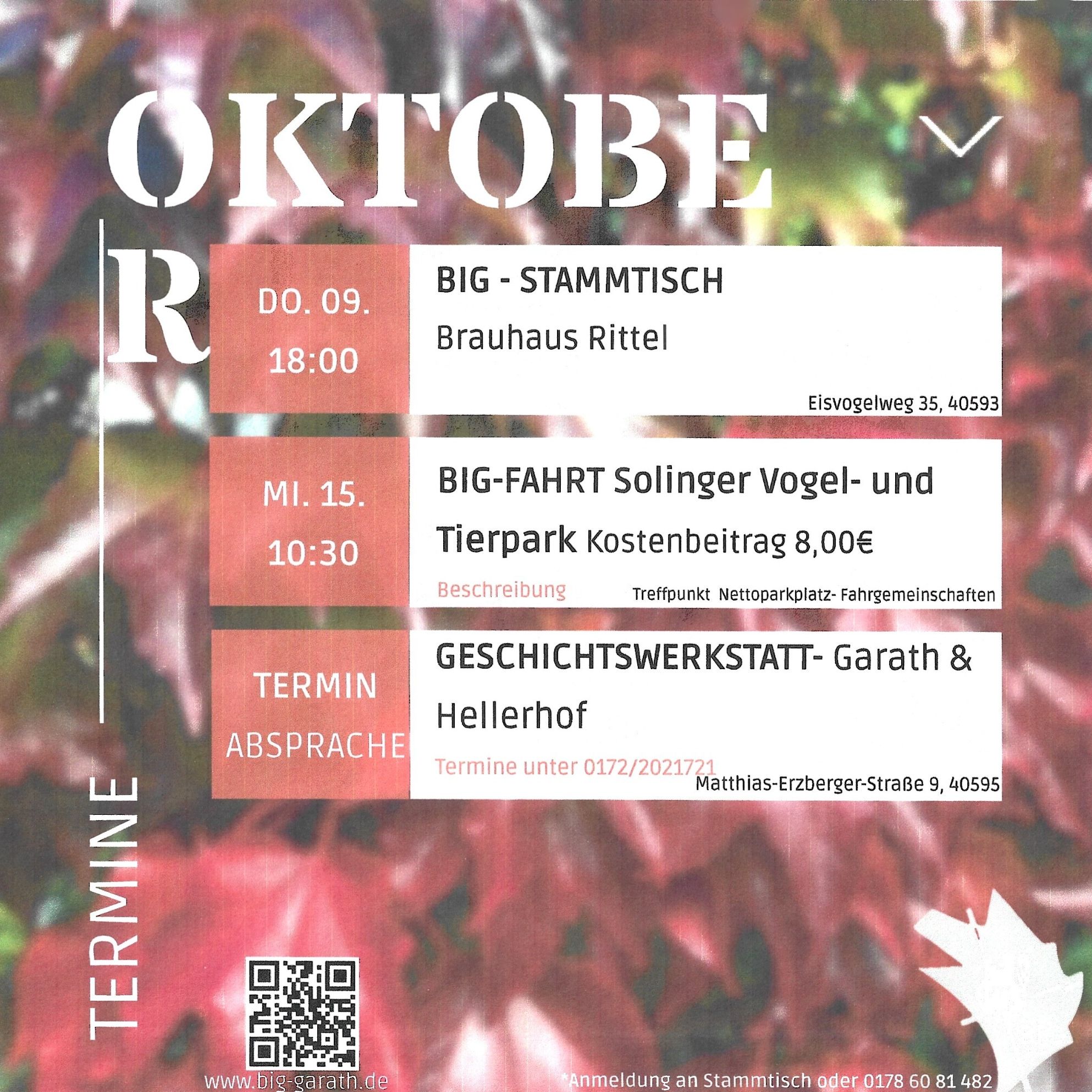 Im "Goldenen Oktober" fahren wir nach Solingen. Der Solinger Vogel- und Tierpark, im Gründungsjahr 1927 auch Ohligser Vogelpark genannt, befindet sich am Rande des Naturschutzgebietes Ohligser Heide. Wir fahren mit dem Auto und bilden dabei Fahrgemeinschaften. Oder kommt zu unserem Stammtisch.